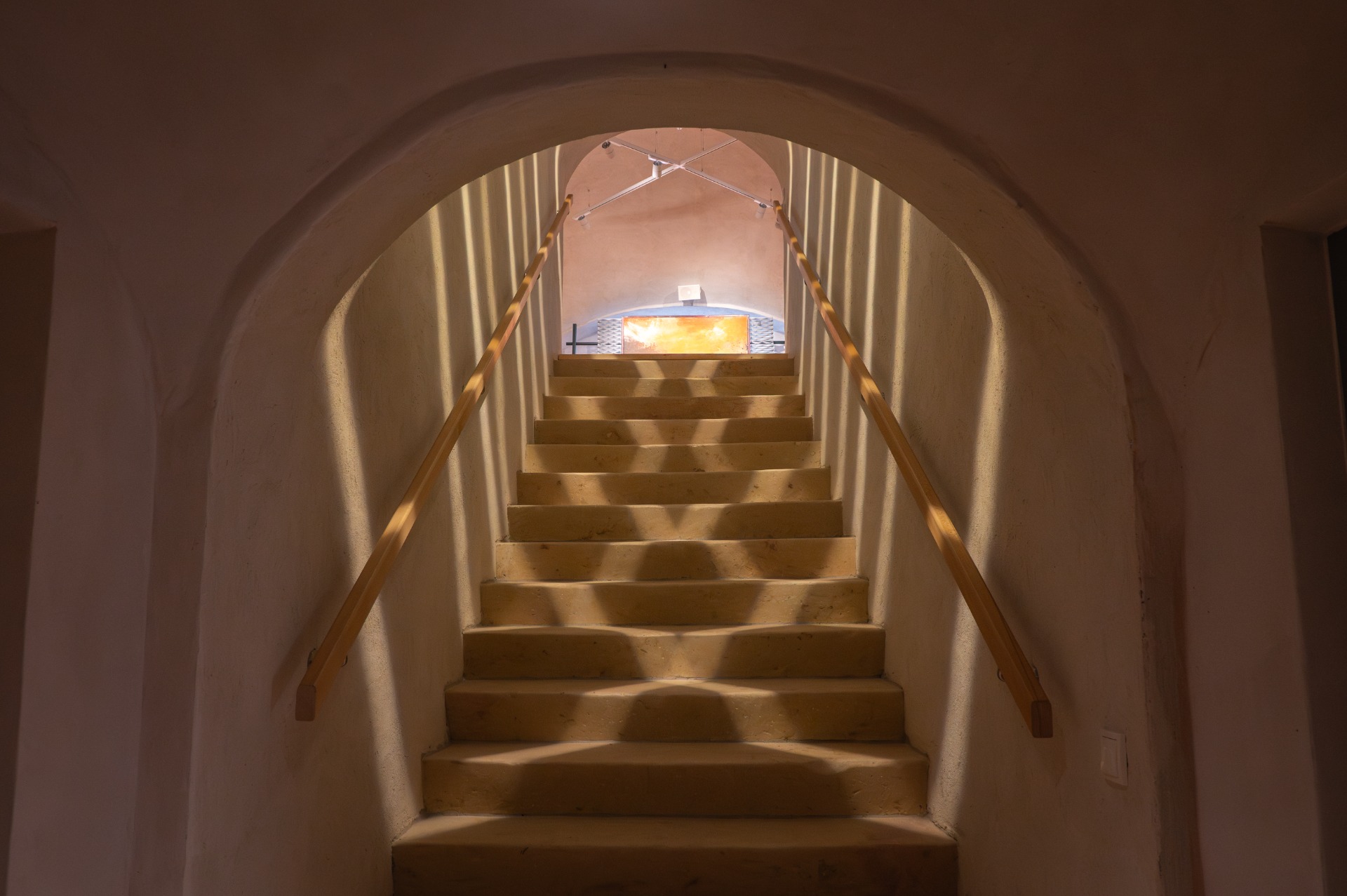 However, the true treasure lies within. The Bělohrad Granary is entirely unique within the Czech context due to its internal spatial arrangement. While most historical granaries featured vaulting only on the ground floor, this structure boasts a system of Neoclassical "Bohemian" sail vaults supported by massive pillars across two consecutive storeys. This lavish structural solution has no known local analogy, marking the building as a technical and architectural monument of the highest order. The atmospheric interior is further enhanced by an unusually grand staircase and a historical "inclined queen-post truss" (ležatá stolice), which survives in the attic as a lingering echo of the High Baroque.