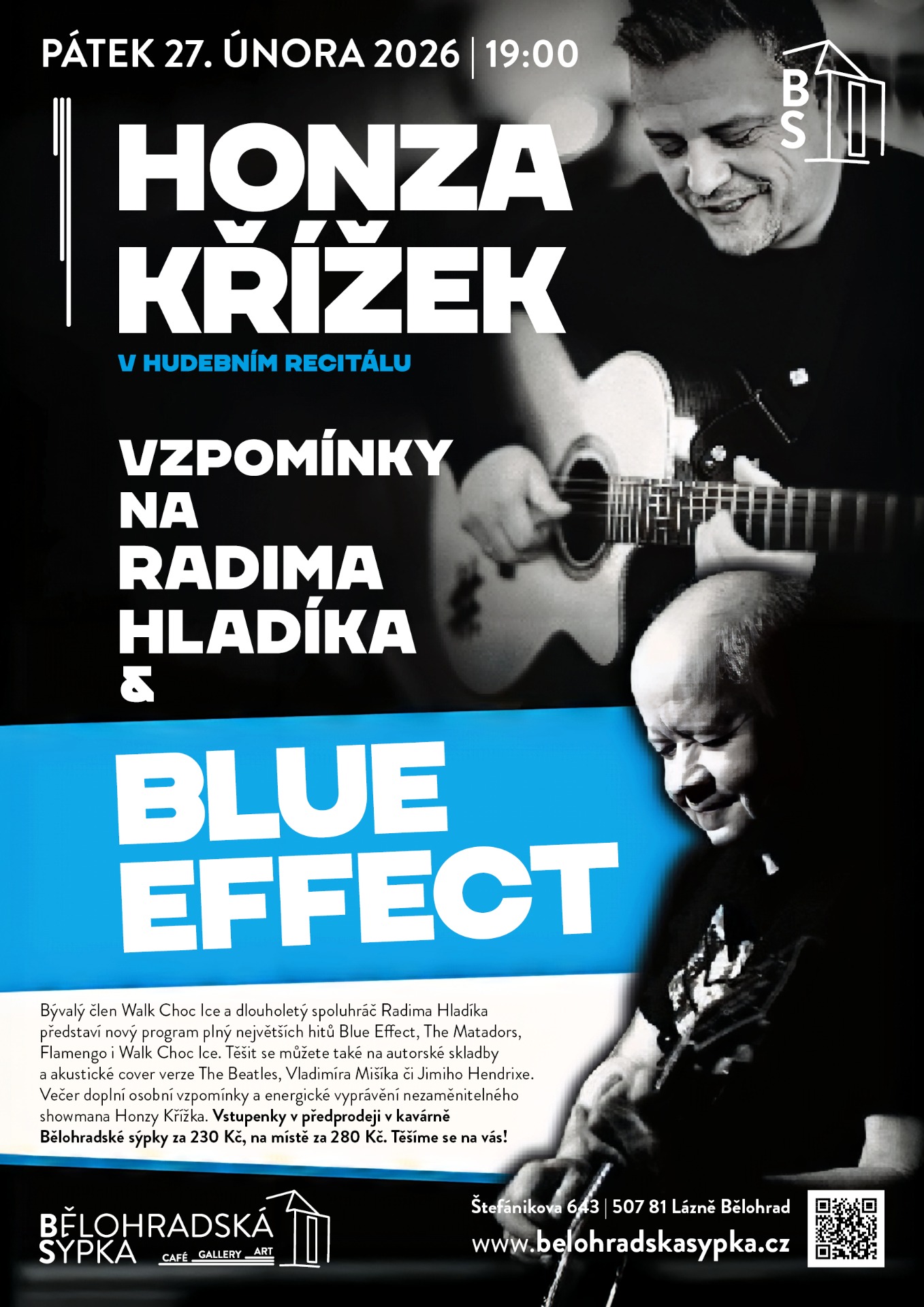 V intimním akustickém provedení se můžete těšit na největší hity Blue Effect, jako jsou nesmrtelné písně Slunečný hrob či Rosenka, i na skladby z art rockového období, například Avignonské slečny z Prahy nebo 33. Program večera je však mnohem bohatší. Zazní také písně skupin The Matadors a Flamengo, či výběr hitů formace Walk Choc Ice, které Honza s Radimem s oblibou společně hrávali.