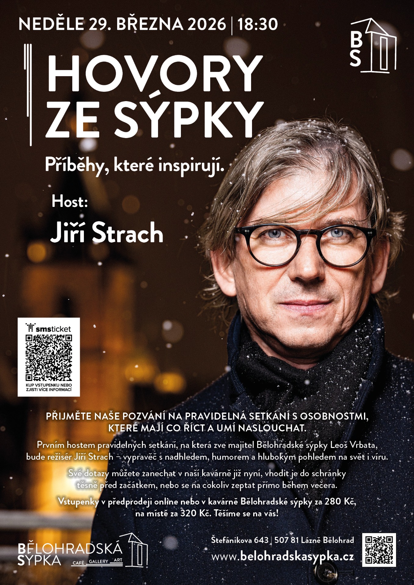 V neděli 29. března 2026 vás od 18 hodin srdečně zveme do kouzelných prostor barokní Bělohradské sýpky na první z cyklu pravidelných setkání s výjimečnými osobnostmi, které formují naši kulturu i myšlení. V unikátní atmosféře historické stavby, kde se snoubí minulost s živou přítomností, vás čeká večer plný silných příběhů, lidskosti a dobré společnosti. Hostitel a majitel Bělohradské sýpky Leoš Vrbata si do tohoto inspirativního prostoru zve hosty, kteří mají co říct a umějí naslouchat. Naším prvním vzácným hostem bude charismatický režisér Jiří Strach. Tvůrce oblíbené pohádky Anděl Páně do Bělohradské sýpky vnese svůj pověstný humor, laskavost, ale i hluboké zamyšlení nad světem a vírou.