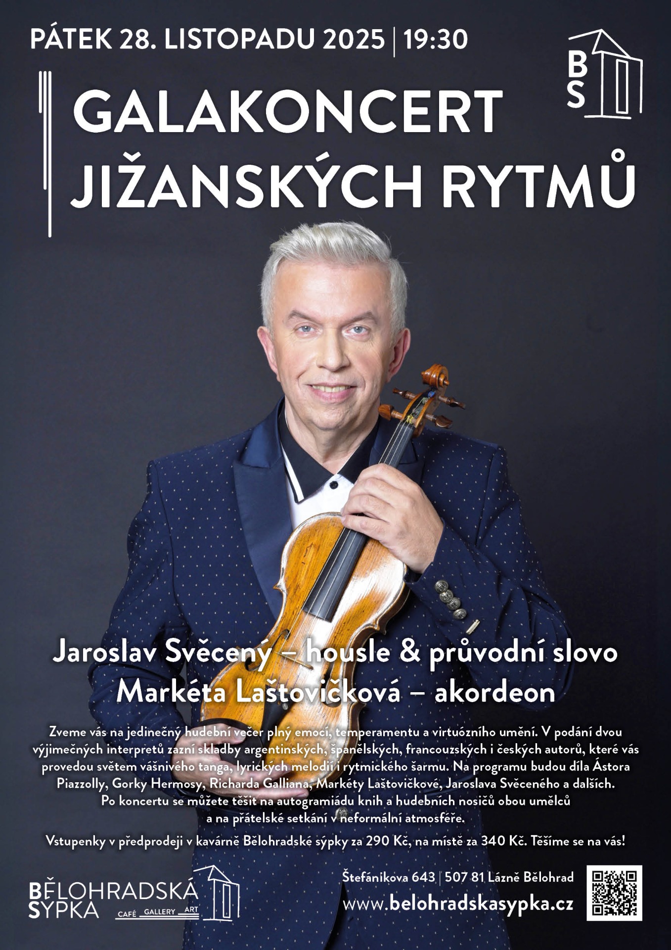 Srdečně vás zveme na výjimečný hudební zážitek, který rozezní Bělohradskou sýpku v pátek 28. listopadu od 19:30 hodin. Čeká vás večer plný emocí, temperamentu a virtuózního umění, který propojí svět klasické hudby s vášní tanga, šarmem francouzských melodií a poetikou české hudební tradice.