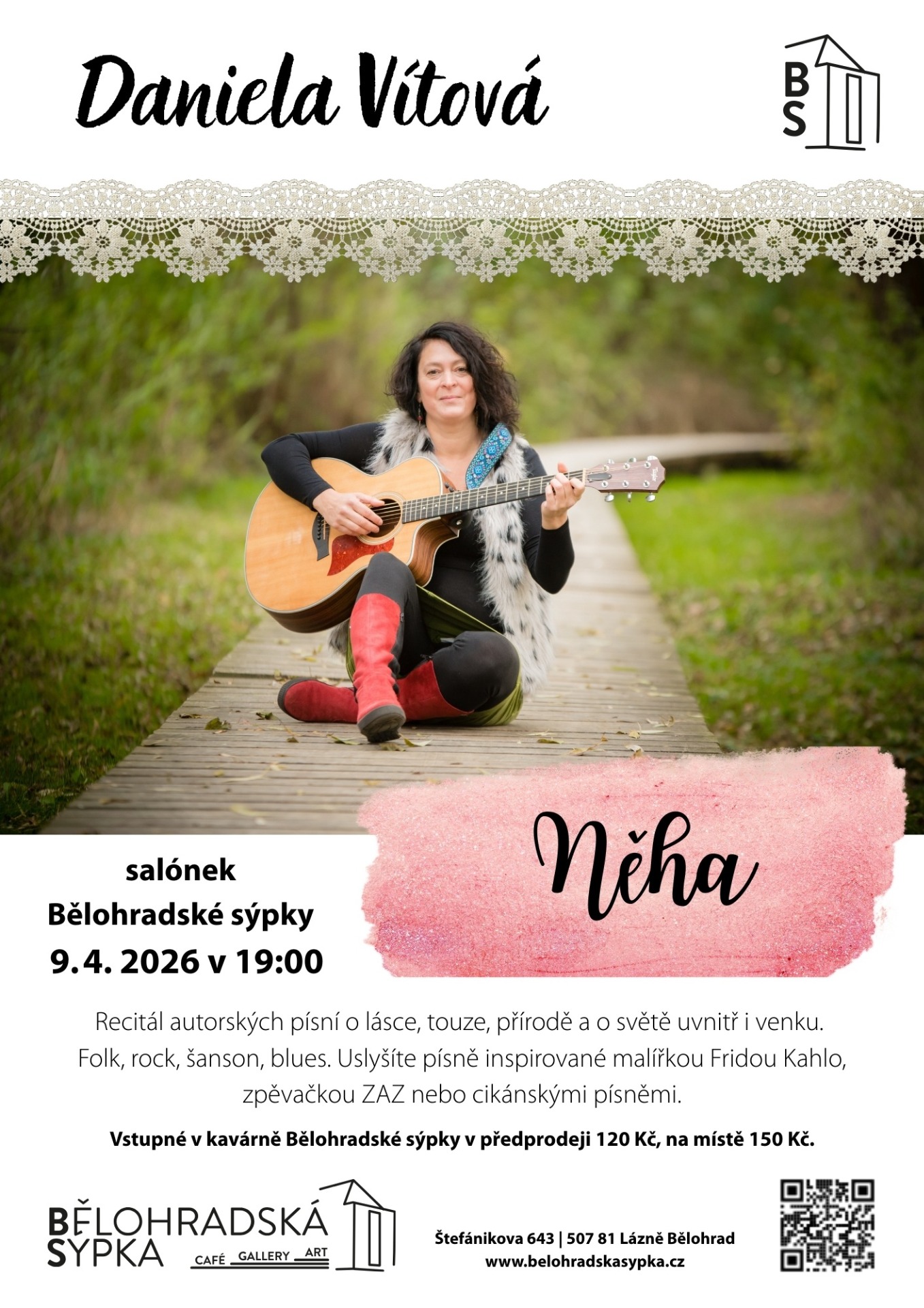 Srdečně vás zveme na hudební večer, který do prostor Bělohradské sýpky přinese zajímavou autorskou tvorbu. Přijďte si poslechnout recitál s názvem Něha, který nám ve čtvrtek 9. dubna 2026 od 19:00 hodin představí zpěvačka a kytaristka Daniela Vítová.