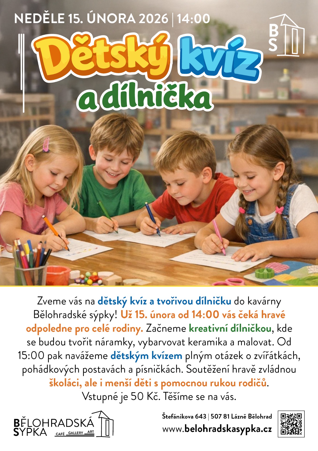 Srdečně vás zveme na hravé odpoledne pro celé rodiny, které se uskuteční 15. února od 14:00 v prostorách kavárny Bělohradské sýpky. Připravili jsme pro vás pestrý program spojující kreativitu a zábavné soutěžení, který je ideální příležitostí, jak si zpříjemnit únorový den a užít si společný čas s dětmi.