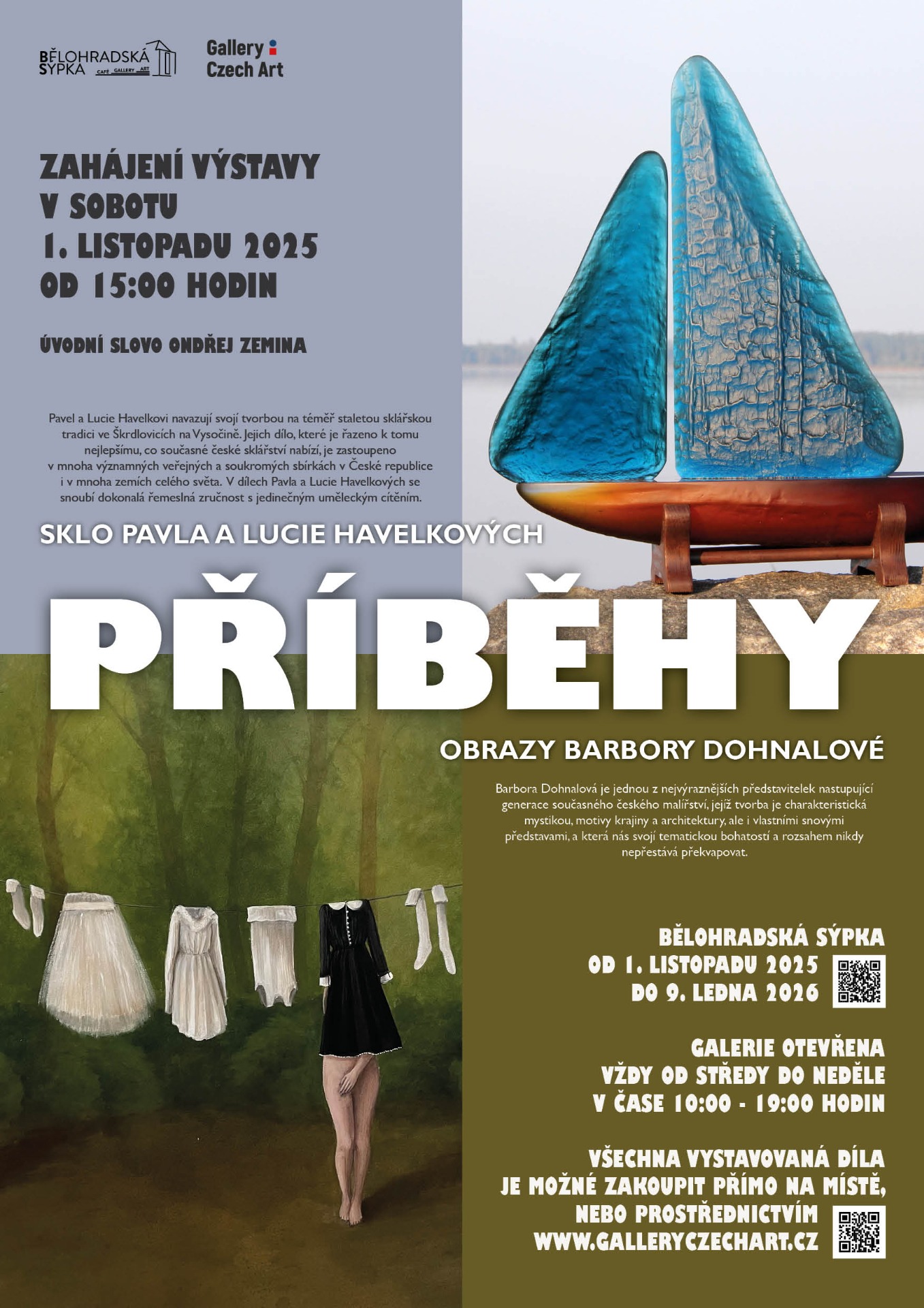 Galerie Bělohradská sýpka vás ve spolupráci s pražskou galerií Gallery Czech Art zve na výstavu, která propojuje příběhy lidí, materiálů a emocí. PŘÍBĚHY – výstava obrazů Barbory Dohnalové a sklářských děl Pavla a Lucie Havelkových – není jen setkáním dvou uměleckých světů. Je to dialog mezi mystikou malby a křehkostí skla, mezi tradicí a současností, mezi snem a realitou.