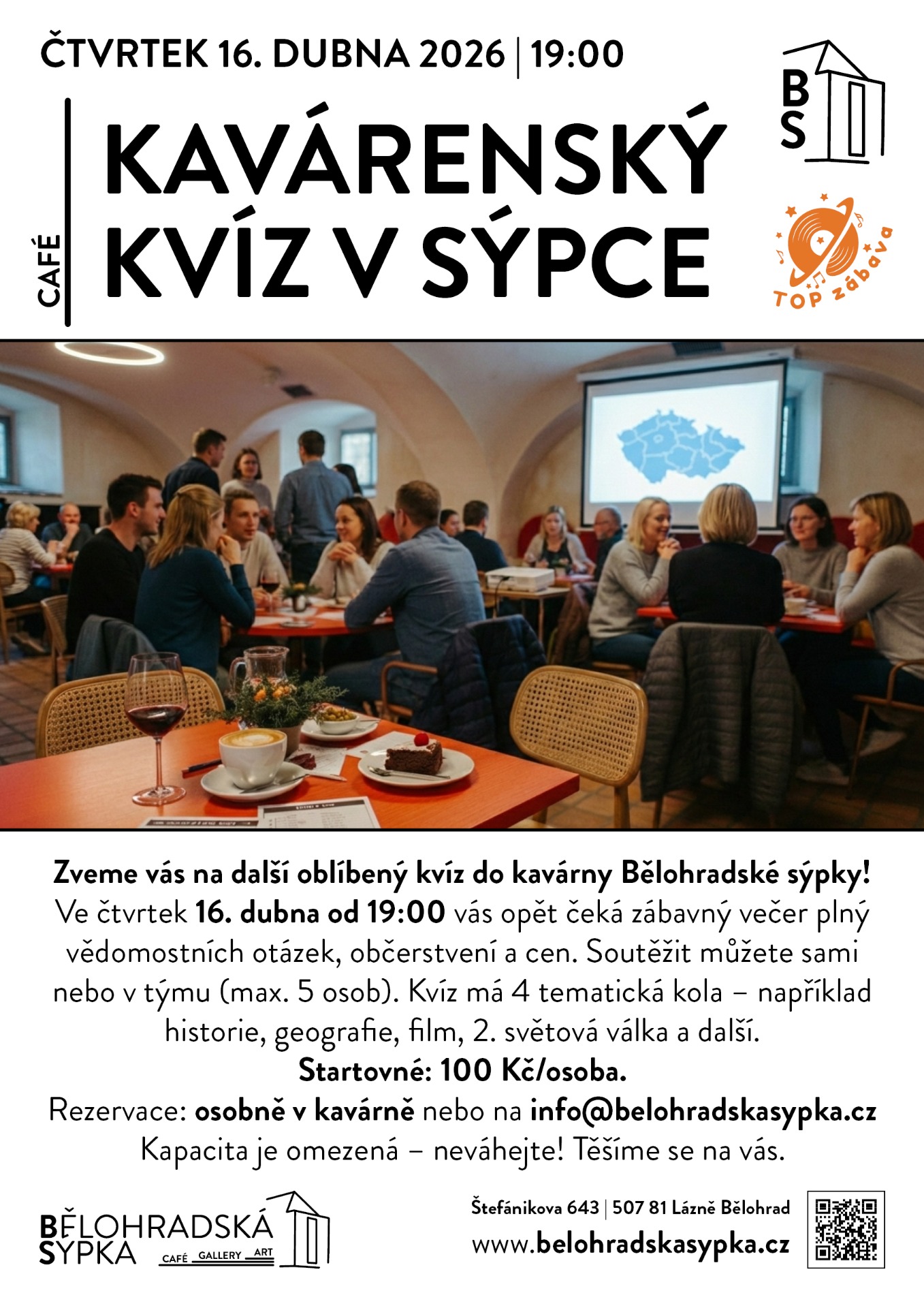 Srdečně vás zveme na zábavný a soutěžní večer v útulné kavárně Bělohradské sýpky. Připravili jsme pro vás Kavárenský kvíz – oblíbenou vědomostní hru, která prověří vaše znalosti z různých oblastí a zároveň nabídne příjemnou atmosféru, občerstvení a možnost vyhrát zajímavé ceny.