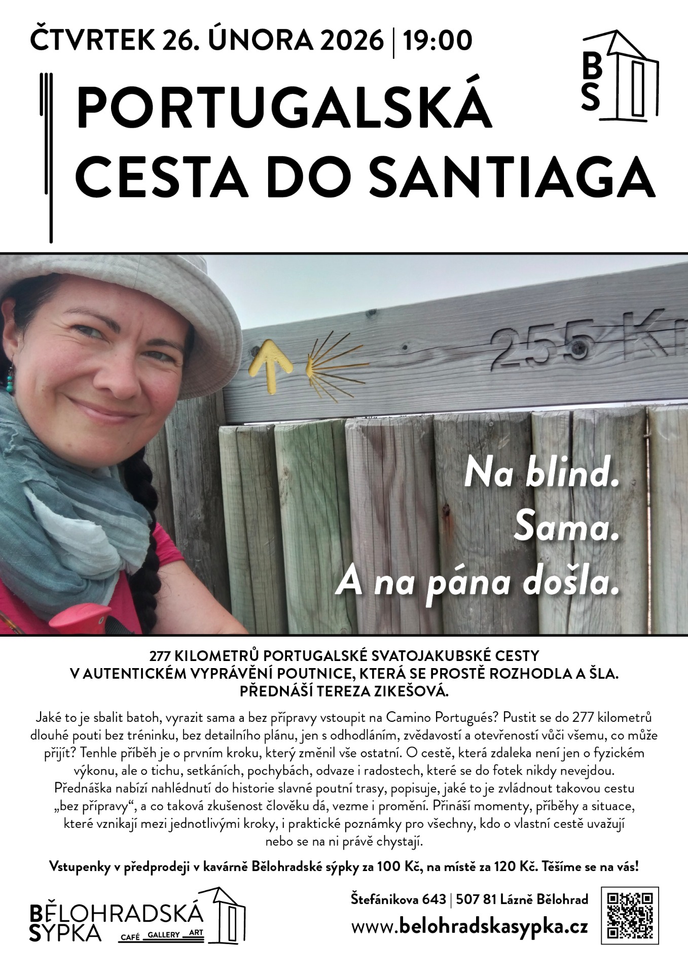 Ve čtvrtek 26. února vás od 19:00 hodin zveme do Bělohradské sýpky na další večer plný inspirace a cestovatelských zážitků. Jaké to je, když se jednoho dne prostě rozhodnete, sbalíte batoh a bez tréninku vyrazíte na 277 kilometrů dlouhou pouť? Žádné velké plány, žádná cestovka, jen vy, cesta a otevřená mysl. Pokud hledáte odvahu udělat životní změnu, nebo jen chcete strávit podvečer s vůní eukalyptových hájů a oceánu, přijďte si poslechnout příběh, který začal jedním odvážným krokem.