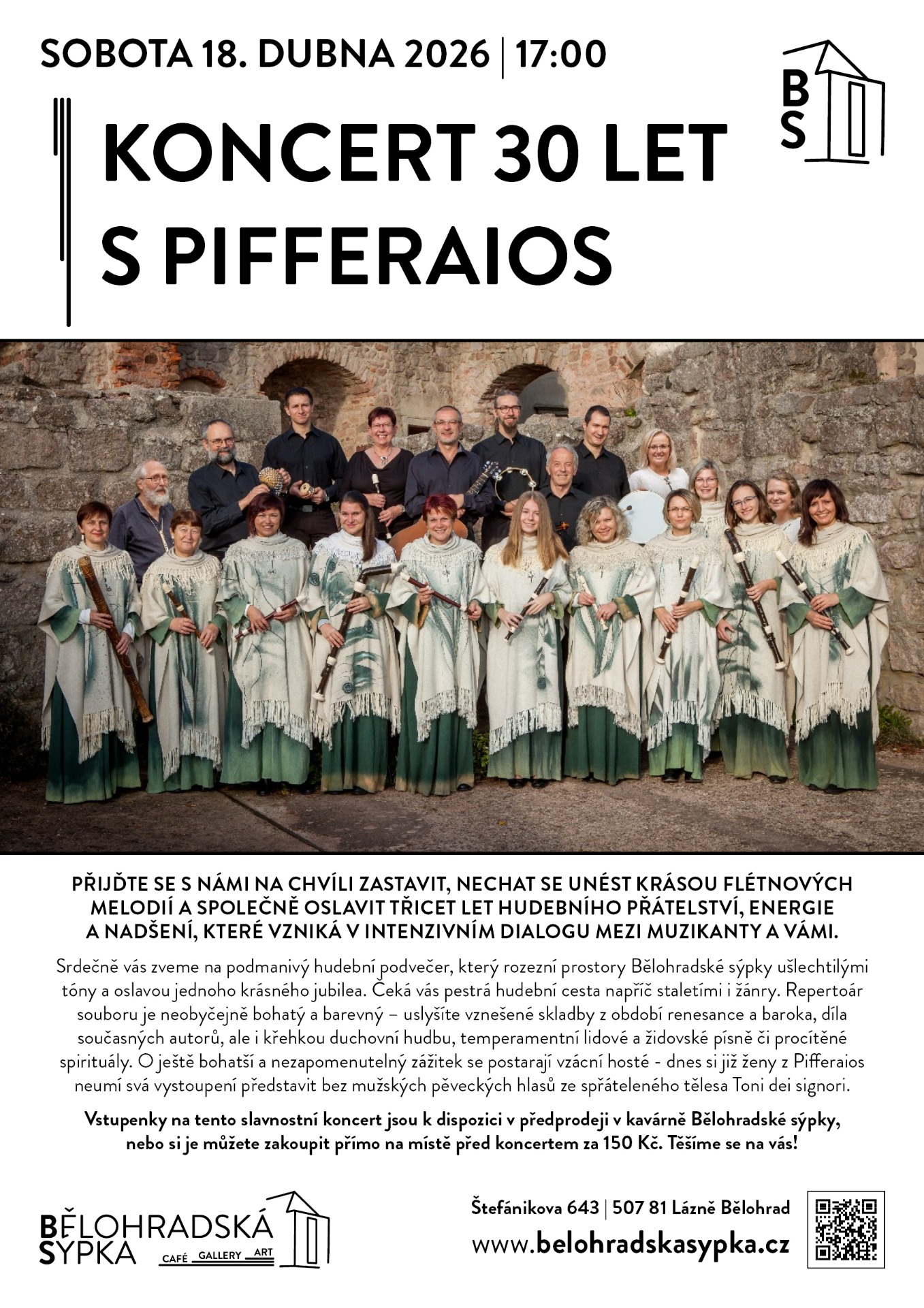 Srdečně vás zveme na podmanivý hudební podvečer, který v polovině dubna rozezní prostory Bělohradské sýpky ušlechtilými tóny a oslavou jednoho krásného jubilea. Přijďte prožít radost z hudby a společné harmonie na koncert k významnému výročí ženského flétnového souboru Pifferaios, který se uskuteční v sobotu 18. dubna 2026 od 17:00 hodin.