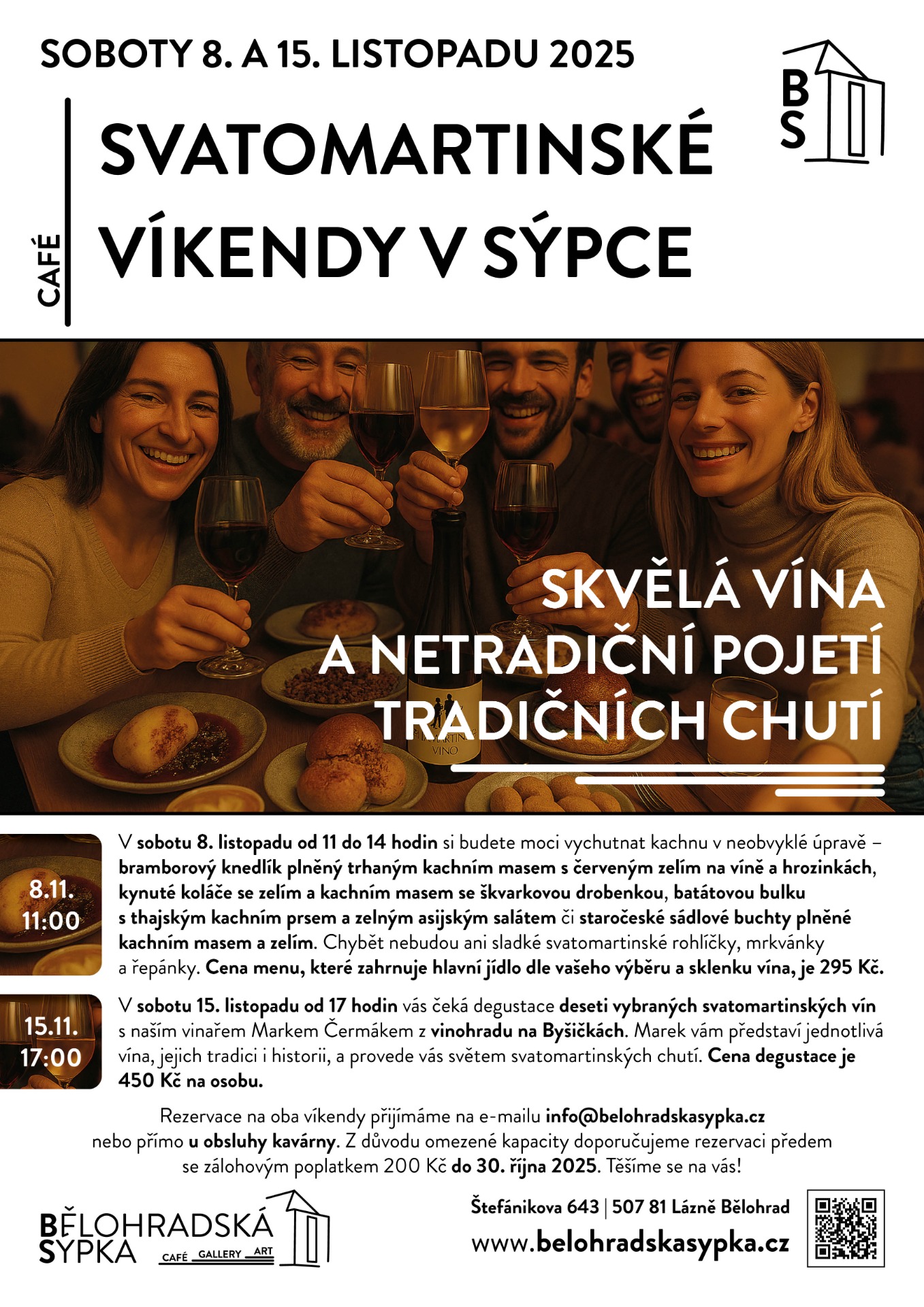 Rezervace na oba víkendy přijímáme na e-mailu info@belohradskasypka.cz nebo přímo u obsluhy kavárny. Z důvodu omezené kapacity doporučujeme rezervaci předem se zálohovým poplatkem 200 Kč do 30. října 2025. Těšíme se na vás!